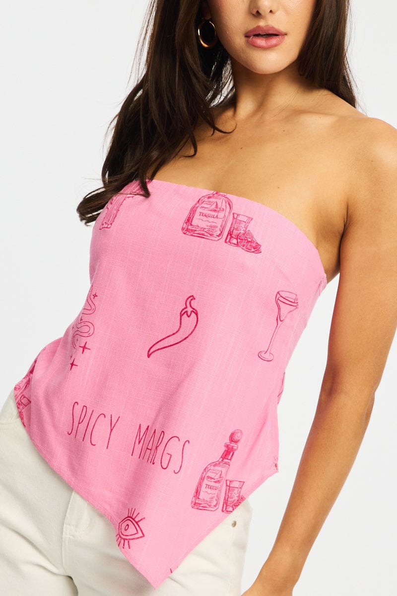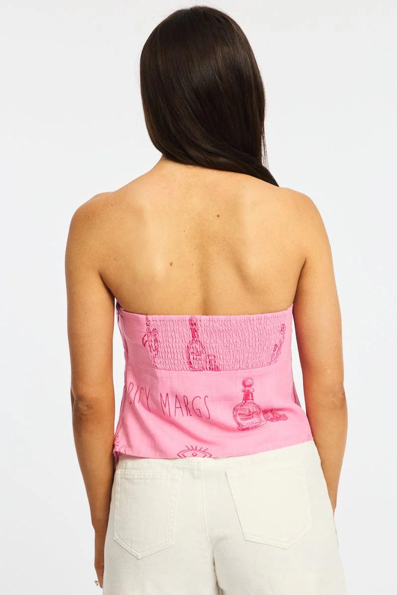 Pink Abstract Scarf Bandeau Top Sleeveless Strapless Linen Blend